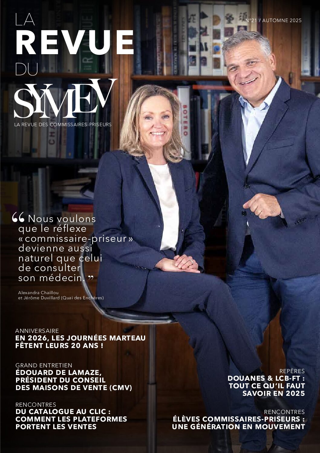 La Revue du Symev n°15 – juin 2017 Dossier : “Nouvelles générations de commissaires-priseurs : comment bien les préparer aux défis du métier ?” Consultation de jeunes CP et d’élèves CP ; entretien avec Frédéric Ballon (Drouot Formation) ; tribune de Gérard Sousi (Institut Art & Droit). Actions du Symev : “Commerce de l’ivoire : une victoire du Symev et… du bon sens !” ; “Vers un ordre professionnel : réponse à Maître Pierrat sur la prétendue impossibilité de créer un ordre professionnel” Entretien : Michel-Louis Jobert : “Le cyber-risque est, hélas, tout sauf virtuel pour les SVV.” Trésors retrouvés : “Un bronze inédit de Camille Claudel.” Portrait d’un CP : “Jérôme Delcamp : une synthèse idéale.” Télécharger la Revue 15 au format PDF